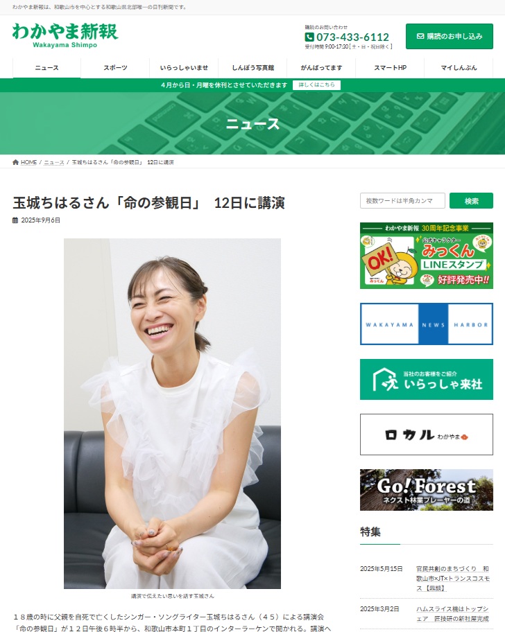【メディア掲載】和歌山新報 ~ 玉城ちはるさん 「命の参観日」12日に講演
